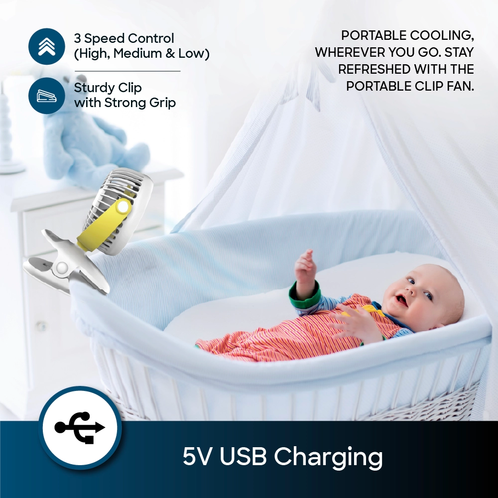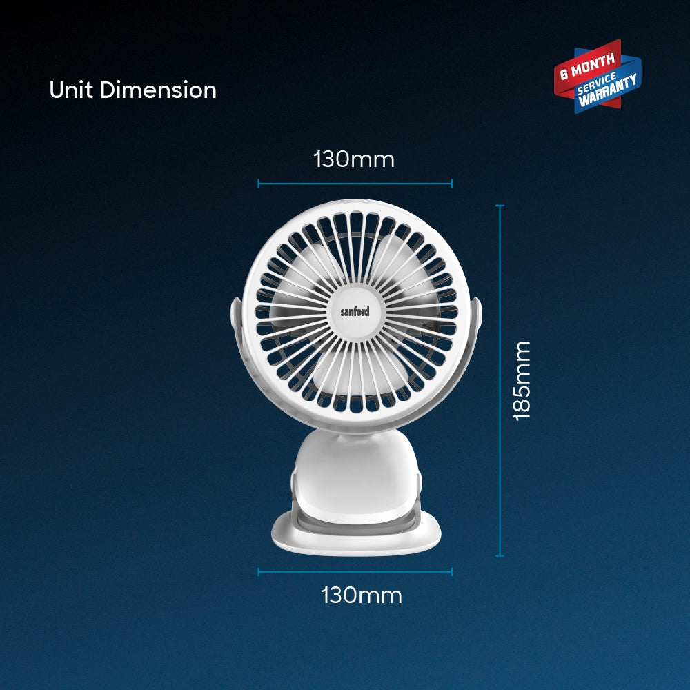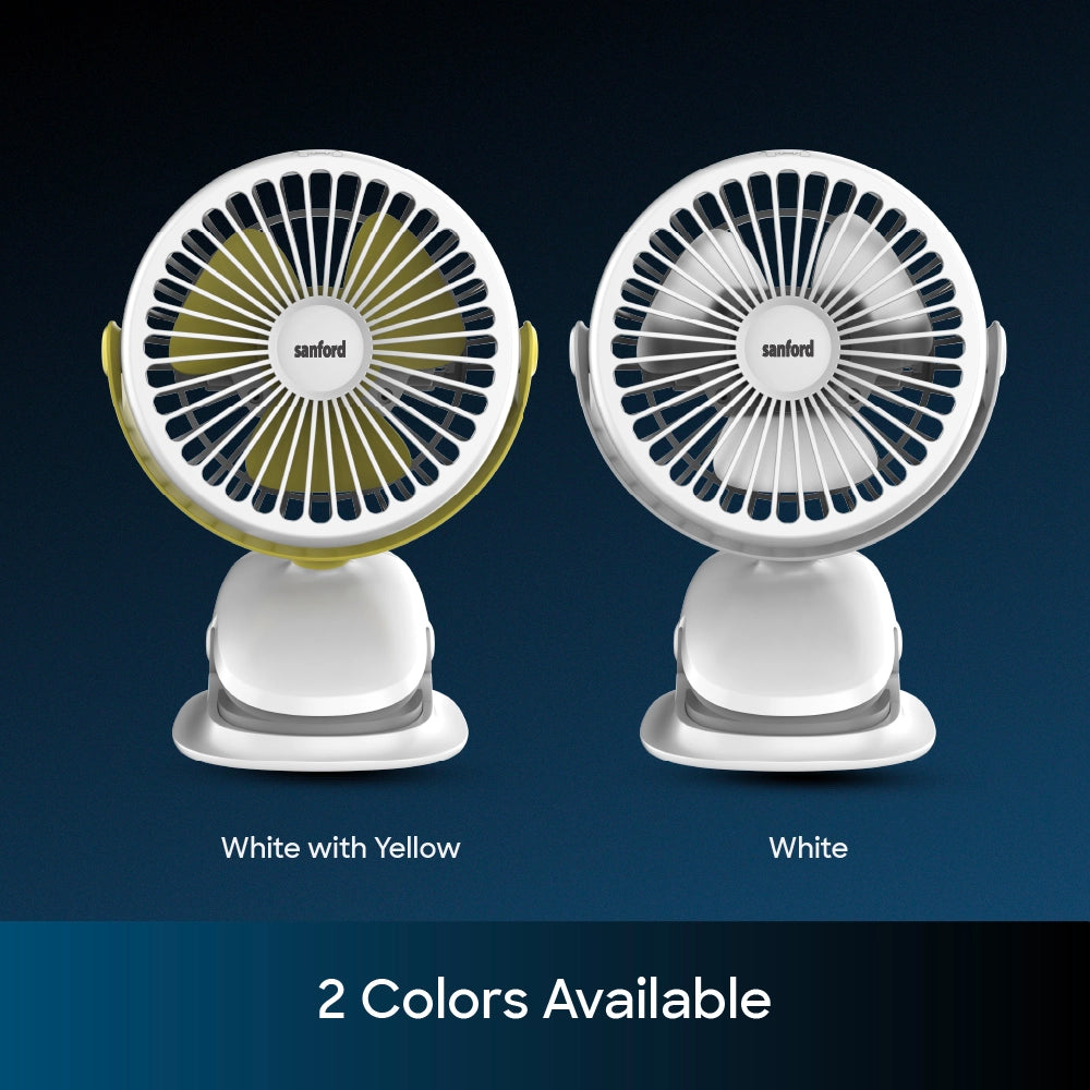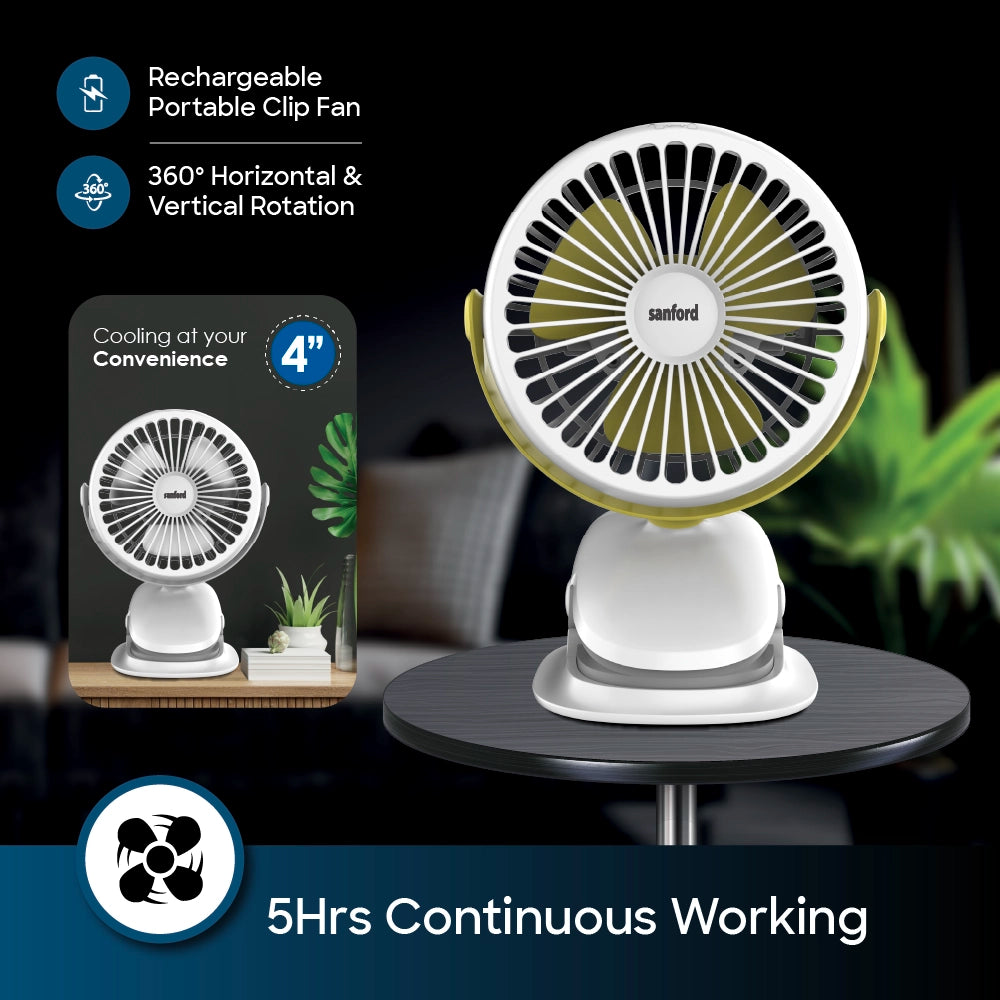 Beat the heat anytime, anywhere with the Sanford 4-Inch Rechargeable Portable Clip Fan. Designed for flexibility and convenience, this compact fan delivers targeted cooling through 360° adjustable rotation, ensuring refreshing airflow at any angle. The strong-grip clip allows you to mount it securely on desks, cribs, or shelves—perfect for tight spaces or on-the-go cooling.