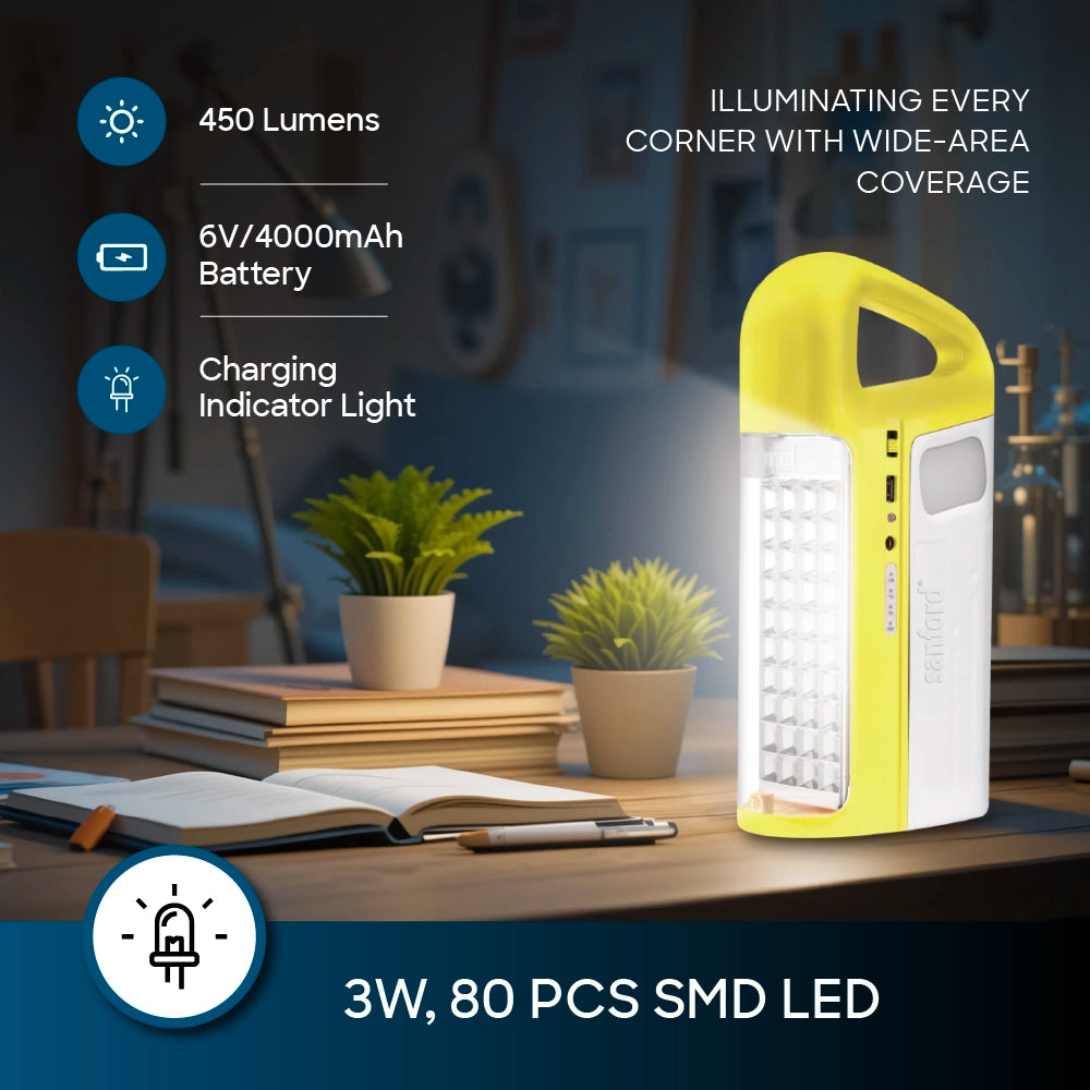 The Sanford Rechargeable Emergency Light is a reliable lighting companion built for long-lasting performance in your home, outdoors, or during emergencies. Featuring 80 high-efficiency SMD LEDs, this lantern delivers powerful illumination with wide coverage, making it ideal for use during blackouts, outdoor camping, or in areas with frequent power cuts.