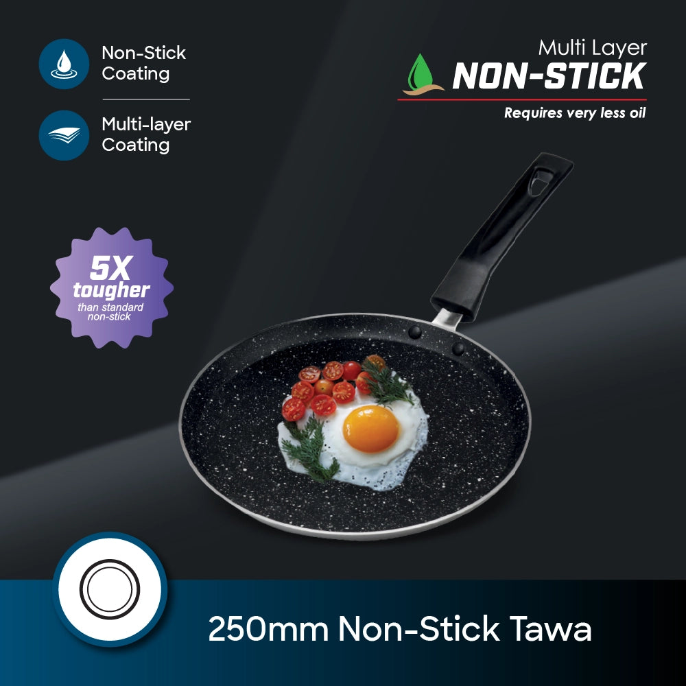Built with a durable multi-layer non-stick coating, it promotes uniform heat distribution and allows for low-oil or oil-free cooking. The 25cm surface provides ample space for even cooking, while the ergonomic handle ensures a secure, cool-touch grip for better control during use. Whether you're a beginner or an expert in the kitchen, this tawa helps you prepare meals with less mess and more speed.