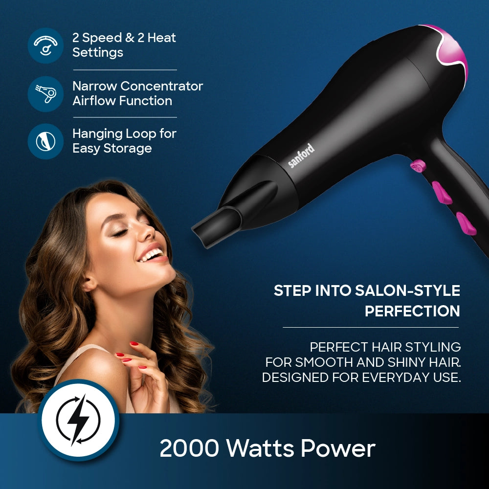 Crafted with durable materials and advanced airflow technology, the Sanford 2000W Hair Dryer is a reliable companion for everyday styling. From quick morning touch-ups to creating intricate looks, it’s built to deliver professional-quality performance at best price.