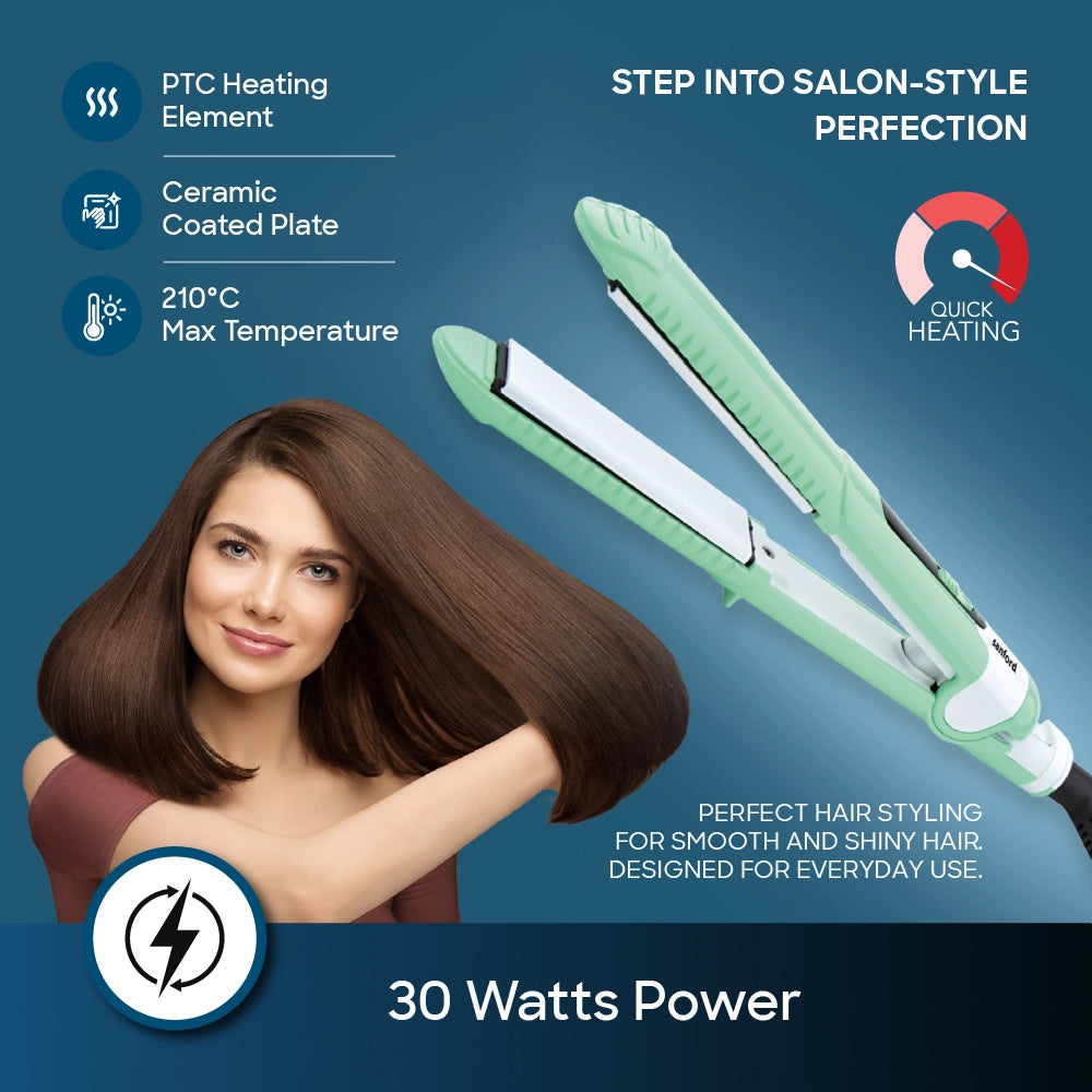 Powered by a rapid-heating PTC element, it reaches optimal styling temperature in minutes, making it suitable for all hair types. The floating plate design adjusts to your hair’s thickness, ensuring uniform contact for smooth straightening without tugging or pulling. A 360° swivel cord allows hassle-free movement, while its lightweight body ensures comfortable handling during styling.