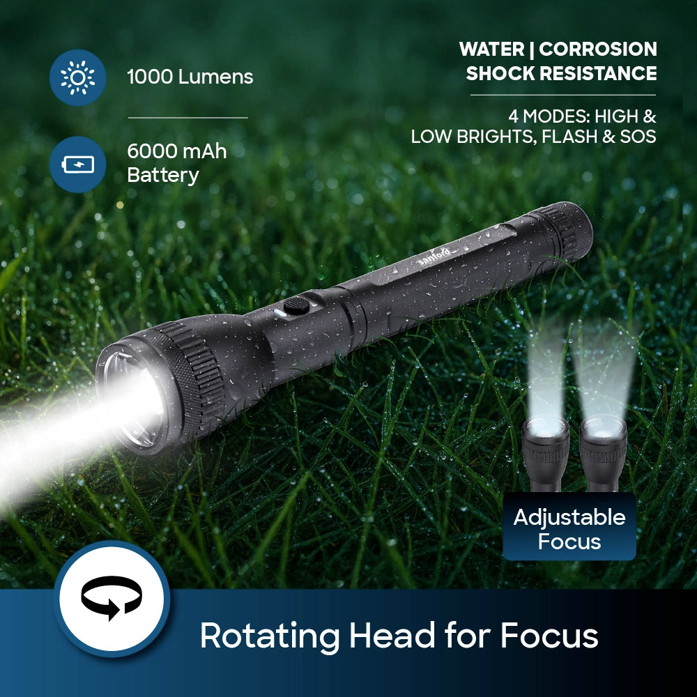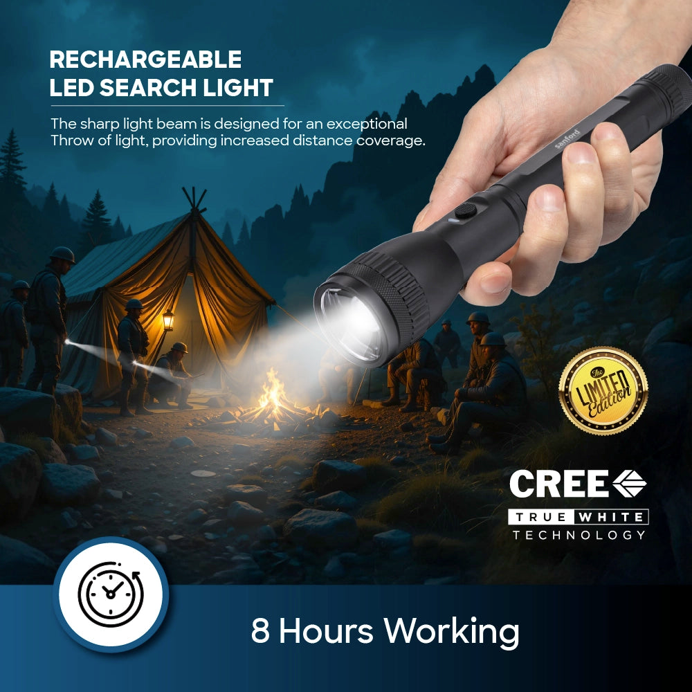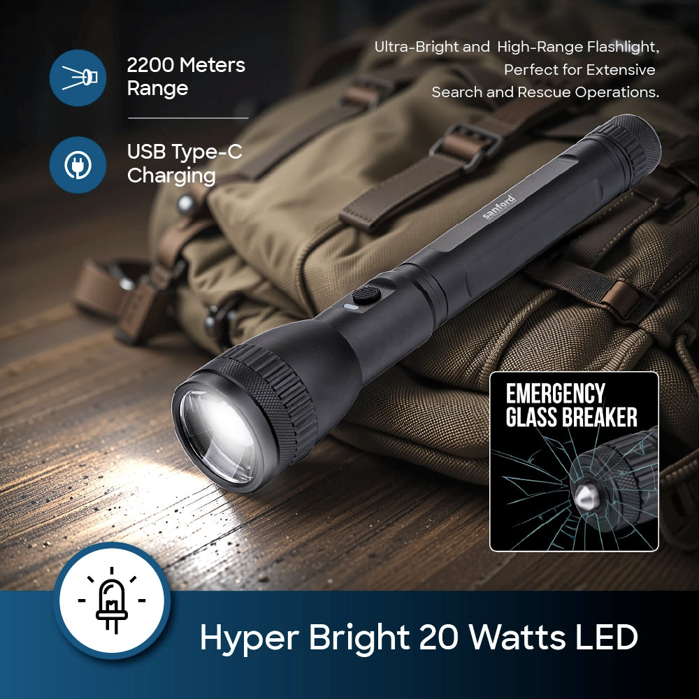 The Sanford Glass Breaker Series Rechargeable LED Torch Flashlight combines powerful brightness with safety features, making it the ultimate lighting solution for both everyday use and emergencies. With its hyper-bright 20W LED delivering 1000 lumens, this torch ensures clear visibility even in complete darkness, reaching an impressive 2200 meters.