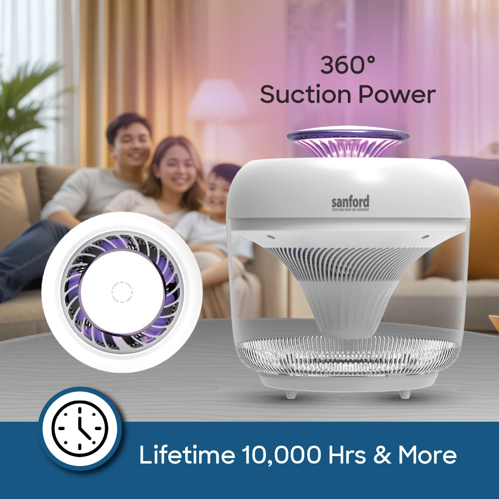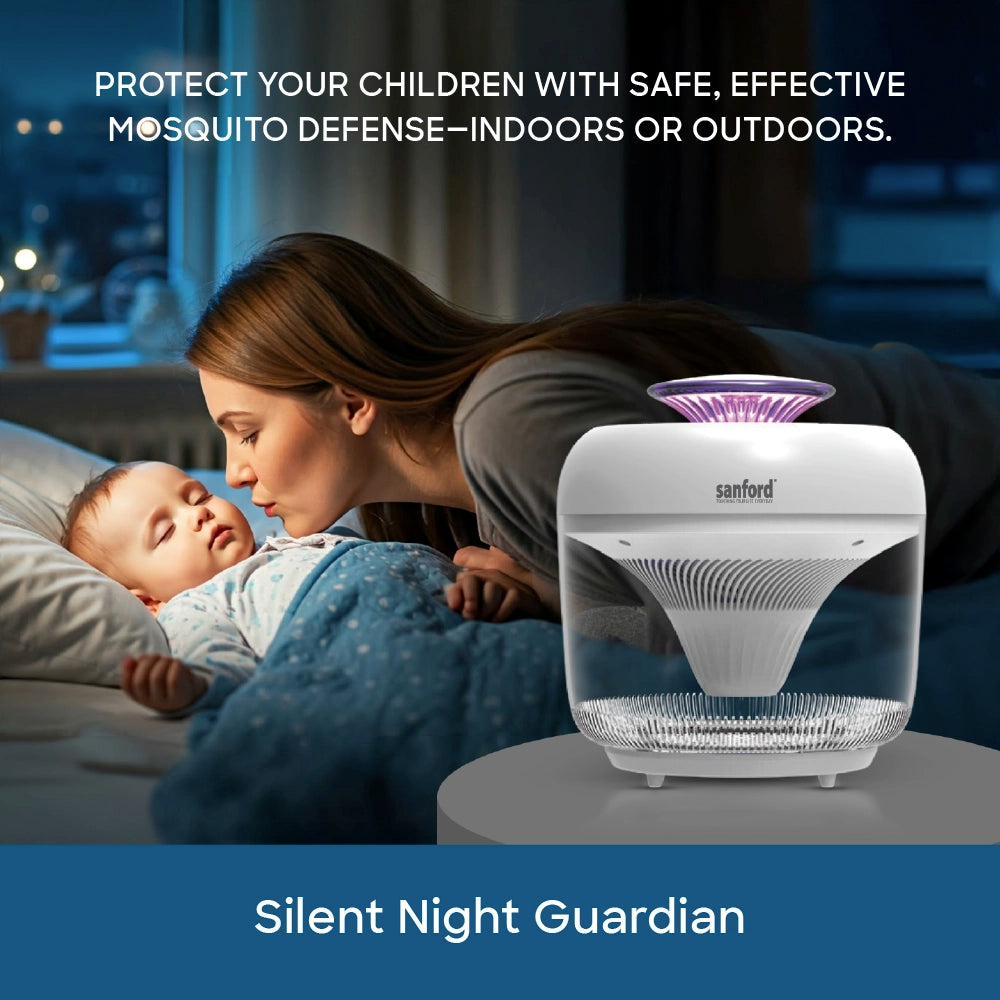 Enjoy peaceful nights and a bug-free environment with the Sanford Mosquito Killer, your silent guardian against irritating mosquitoes. Designed with modern safety and convenience in mind, this device uses UV LED light to attract mosquitoes, then traps them efficiently with its 360-degree suction fan. Free from chemicals and harmful radiation, it ensures a safe sleeping atmosphere for families, babies, and pets.