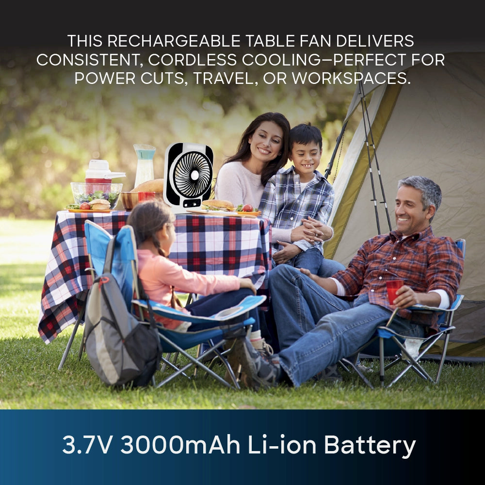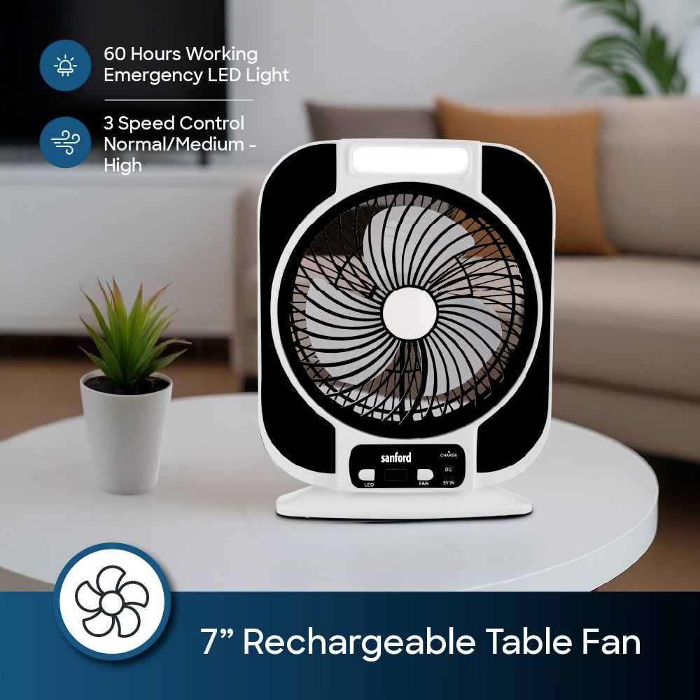 Stay cool and comfortable wherever you are with the Sanford Rechargeable Table Fan, your perfect indoor and outdoor companion. With a 7-inch blade size and compact design, this fan delivers powerful airflow with quiet operation—ideal for home use, camping, picnics, or even during power outages. Designed for Indian lifestyles, it ensures an uninterrupted breeze with portable ease.