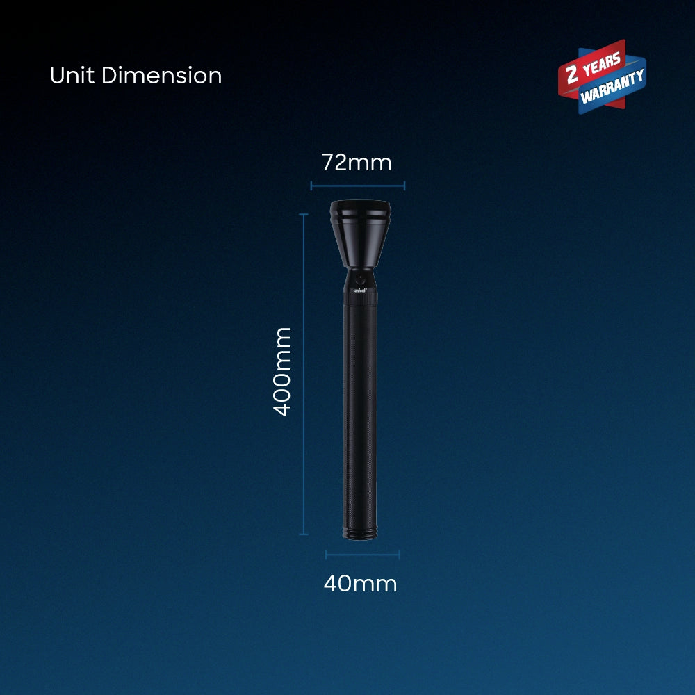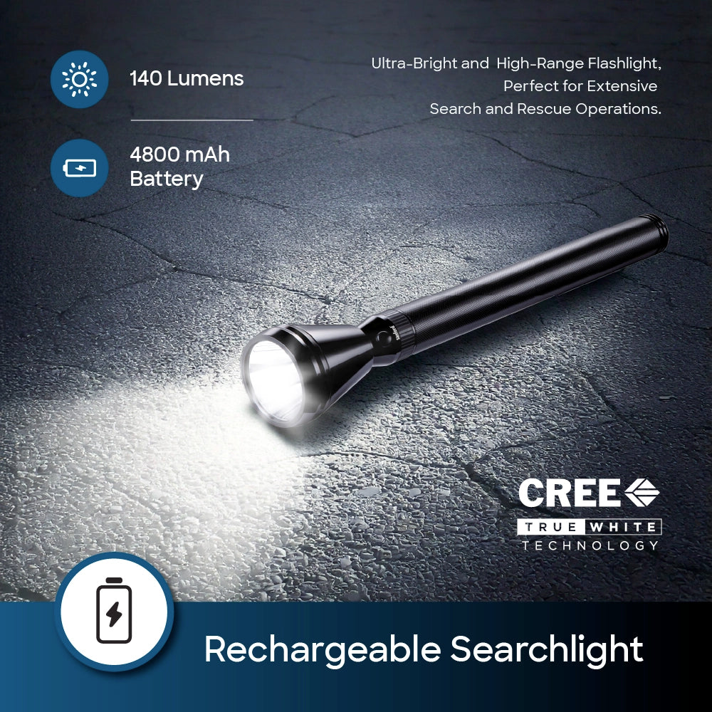This powerful flashlight is powered by a 4800mAh rechargeable battery that delivers up to 300 minutes of continuous use. With features such as shock resistance, corrosion protection, and an unbreakable front cover, it’s ready for any challenge. The torch recharges fully in 14 hours using standard AC charging and includes SASO certification and Sanford’s lifetime LED warranty for extra peace of mind.