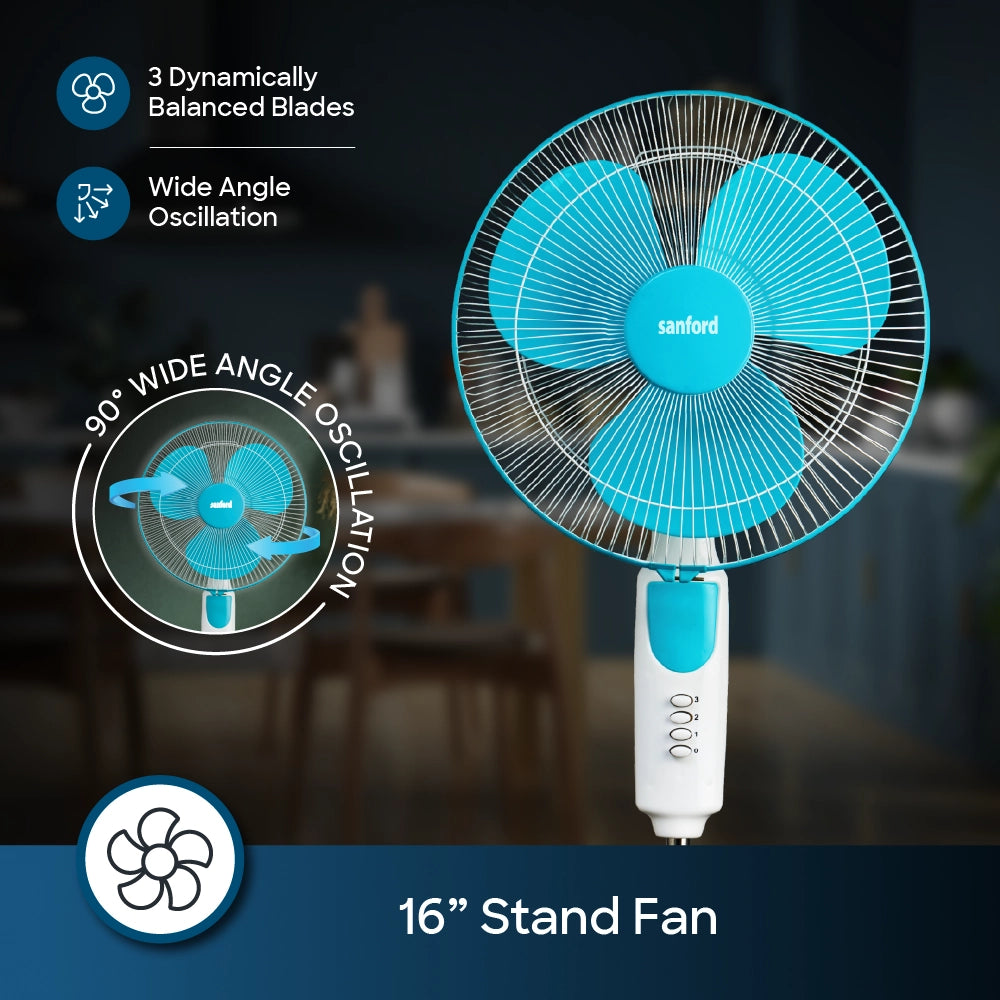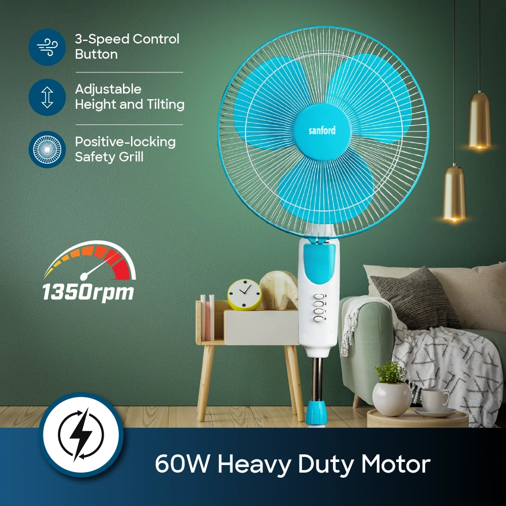Beat the heat effortlessly with the Sanford 16-Inch Stand Fan, a reliable cooling solution built to deliver comfort throughout the Indian summer. Engineered with a robust 60W heavy-duty motor, this stand fan ensures consistent and powerful airflow while operating quietly, making it perfect for homes, offices, or any indoor space where peace and performance matter.