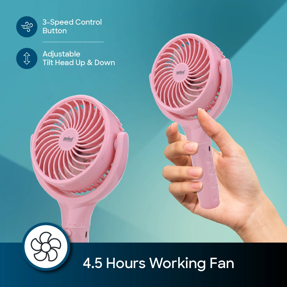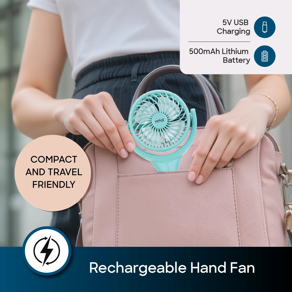 Stay cool and comfortable anytime, anywhere with the Sanford Rechargeable Hand Fan, a compact and portable cooling solution designed for your active lifestyle. With a powerful 3800 RPM motor and 3-speed control, this fan delivers efficient airflow whether you're at home, traveling, commuting, or working at your desk.