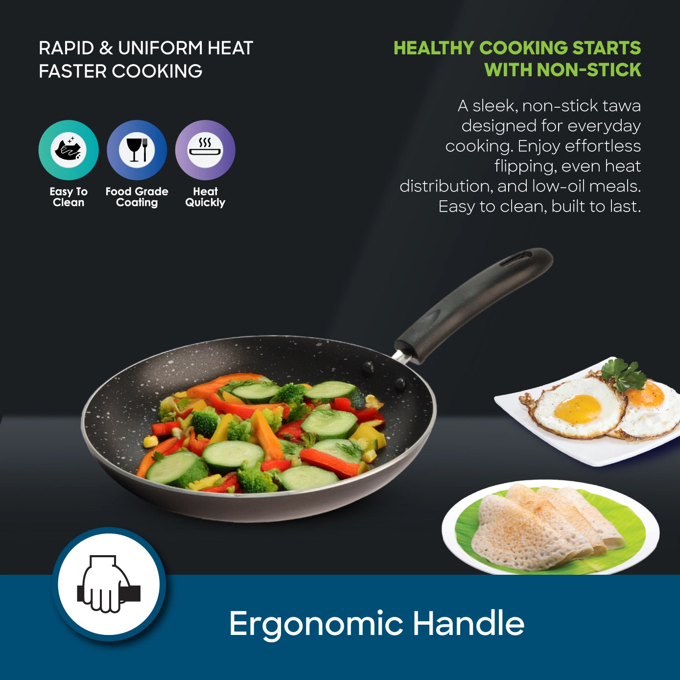 Designed for comfort and safety, the ergonomic firm grip handle stays cool and provides secure handling during high-heat use. Made with food-grade materials, this pan combines modern performance with long-lasting durability, making it a dependable addition to any kitchen.