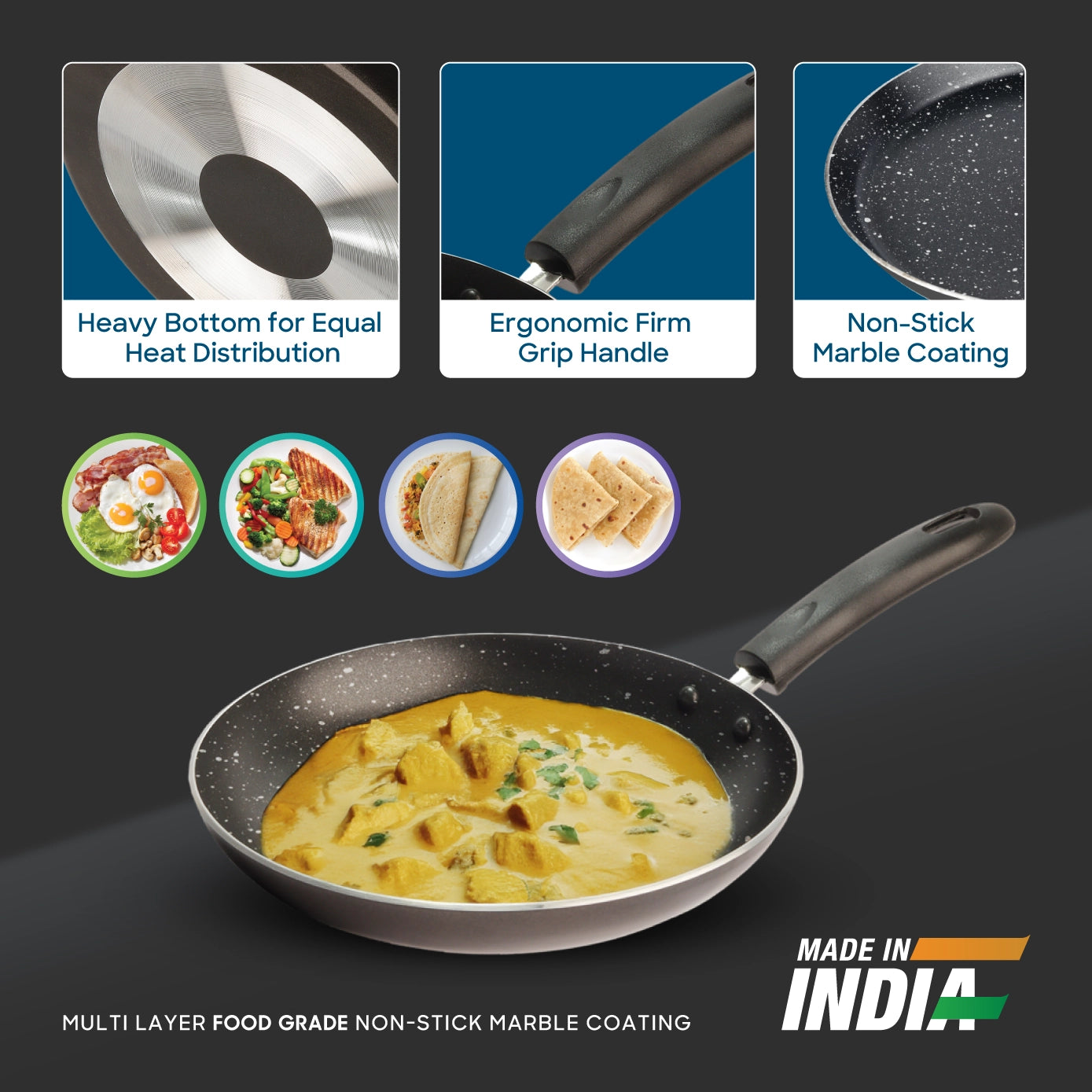 The pan features a durable multi-layer marble non-stick coating that offers excellent food release and makes cleaning up a breeze. Built with rapid heat-spread technology and a heavy bottom, it delivers even heat distribution—reducing cooking time and enhancing flavor in every dish. The 24cm diameter gives ample room for daily cooking without being bulky, making it ideal for small to medium households.